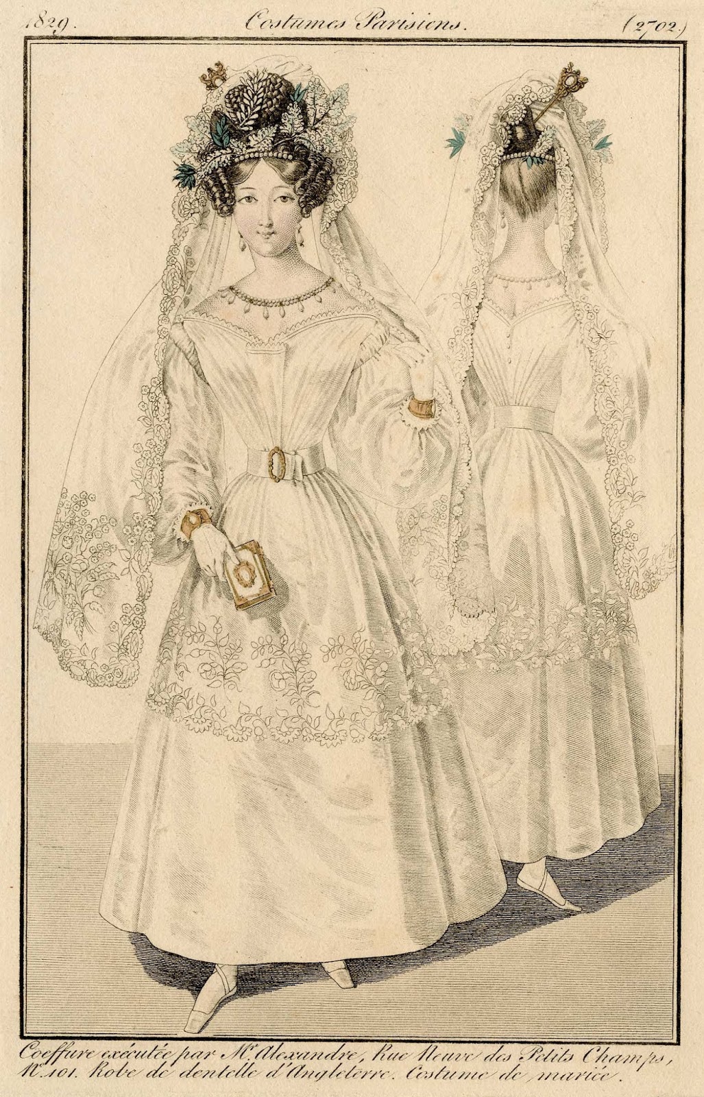 Menyasszonyi ruha szatén alsóruhán levélzet alakú hímes tüll felsőruhával, á la Sevigné derék, á la Mameluke ujjak. Blond fátyol a fejen.