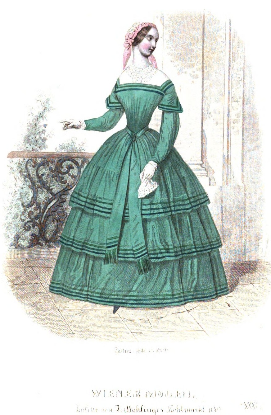 A könnyed szövetű ruhák kettő vagy három szoknyával készülnek. Néhánynak legelegánsabb a tarlatanok közül három van, három sor keskeny szegővel, igen magasan a szegély fölé helyezve, kakastaréj alakban felszedve; mindegyik az oldalán áthurkolva egy ezüst szalagcsokorral, vagy virág bukétával. [...]